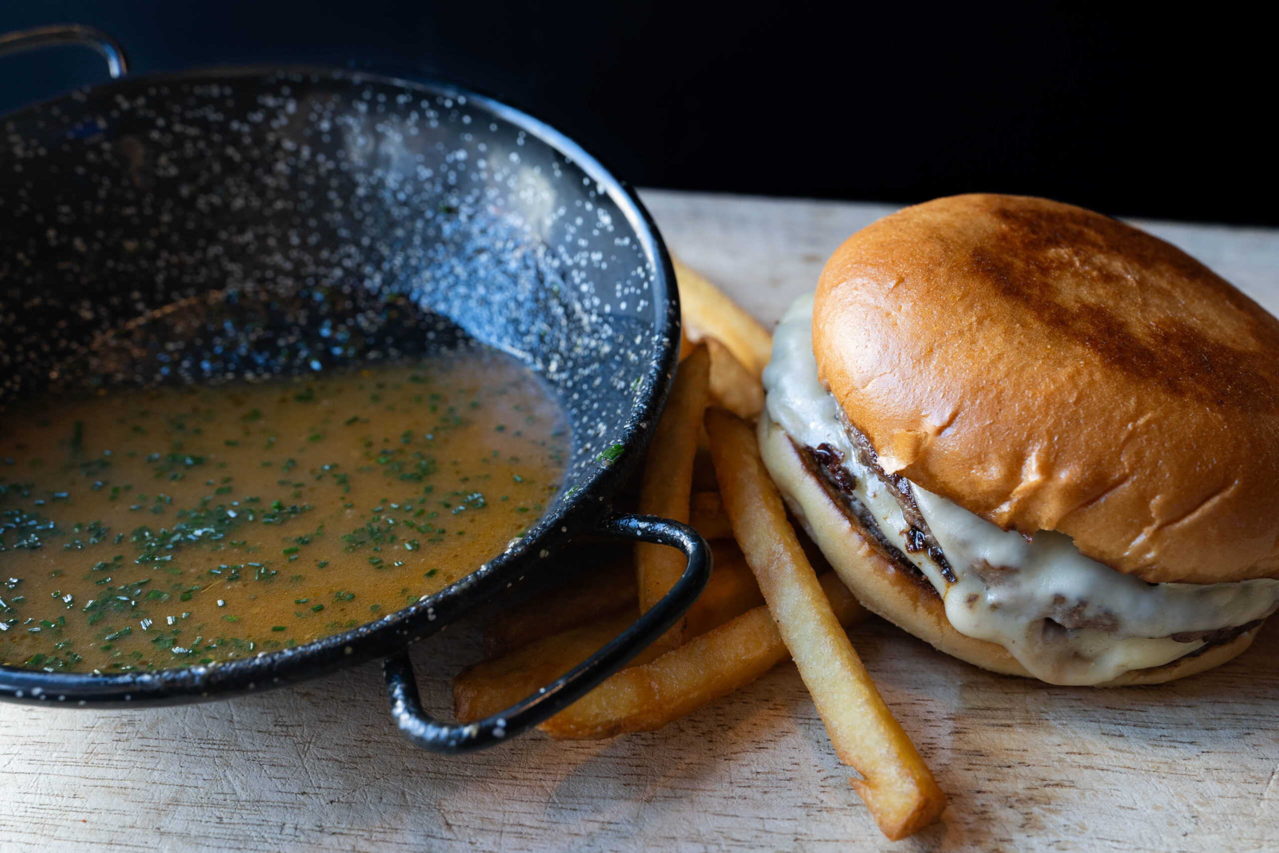 Fyldig fransk løksuppe som dip for burgeren.